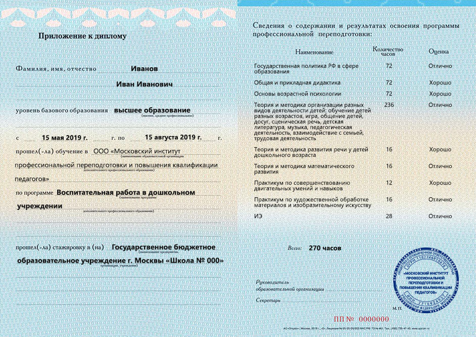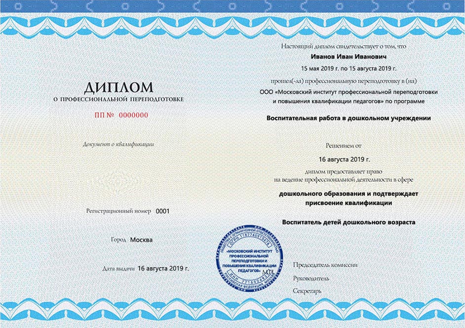 После обучения на курсах профессиональной переподготовки выдается документ о квалификации – диплом установленного образца о профессиональной переподготовке, предоставляющий право на ведение новой профессиональной деятельности в сфере образования. Дипломы защищены от подделок специальным водяным знаком. * Для получения диплома о профессиональной переподготовке, Ваше базовое образование должно относиться к укрупненной группе направлений подготовки, соответствующей данной программе.